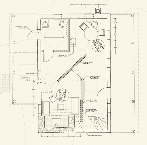 The visitor center acts as a lounge and office for the arboretum, occupying a former farmhouse. My great-grandparents lived in the house during their retirement and was donated by my family to become the arboretum. We designed a renovation to shift the orientation towards a broader community and to sustain moments of gathering, sharing and learning.