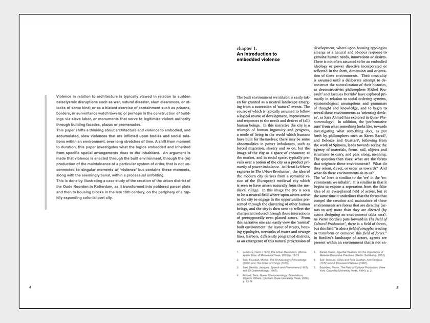 This paper shifts a thinking about architecture and violence to embodied, and accumulated, slow violences that are inflicted upon bodies and social relations within an environment, over long stretches of time. A shift from moment to duration, this paper investigates what the logics embedded and inherited from specific spatial arrangements does to the inhabitant. An argument is made that violence is enacted through the built environment, through the (re)production of the maintainance of a particular system of order, that is not unconnected to singular moments of ‘violence’ but contains these moments, along with the seemingly banal, within a processual unfolding.