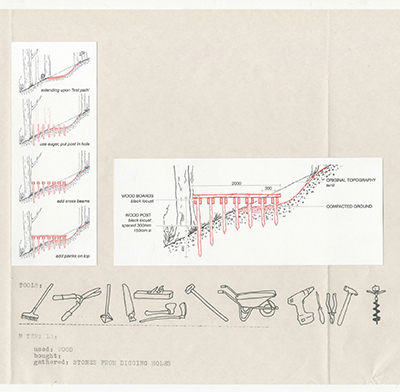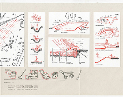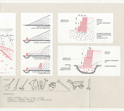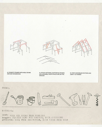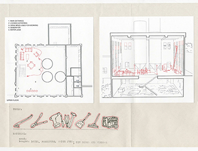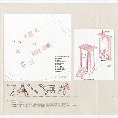 By situating ourselves, as students, being trained to be architects [developers/gentrifiers], within the environment and history that we are in fact within, we positioned ourselves as literal actors within this history, not mere outsiders fulfilling university requirements. Therefore we speculated how we could literally inhabit, or reclaim, this site, with others, in order to transform it into a space of mutual abundance— a break from the history of dispossession. We sketched how we would build this, what tools we would need, what materials, and what methods of construction we would use if we were to begin today.