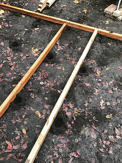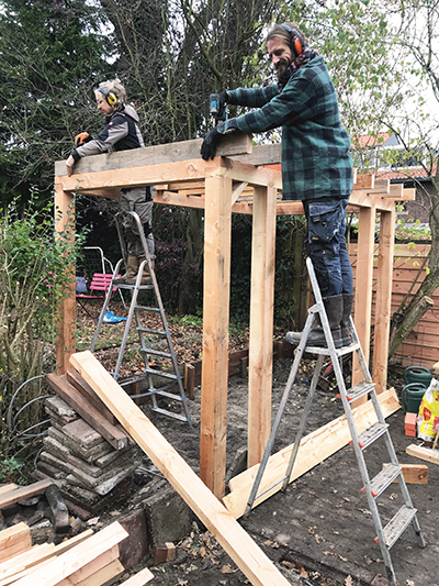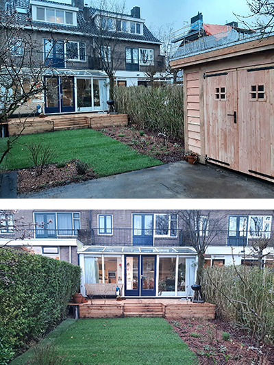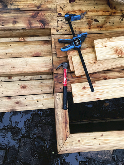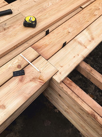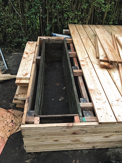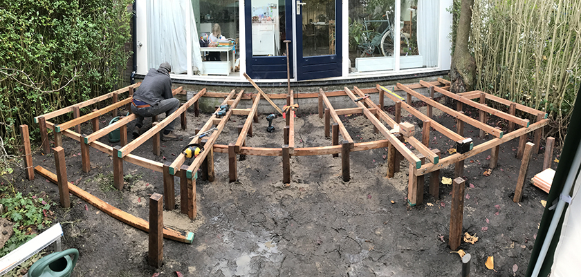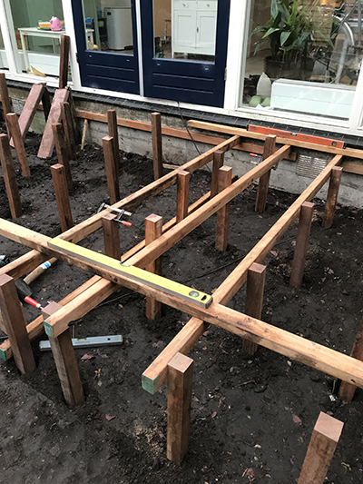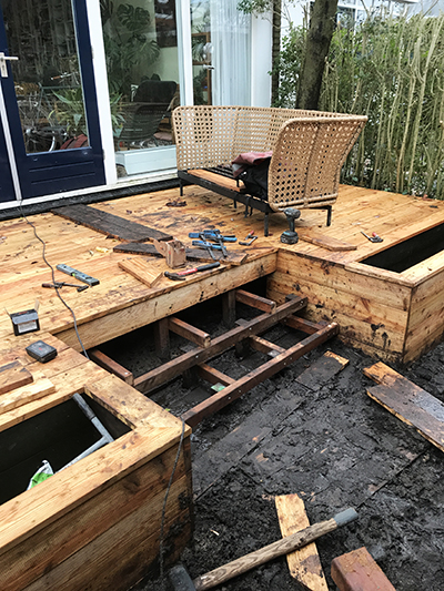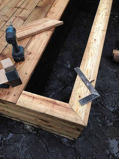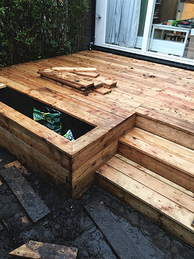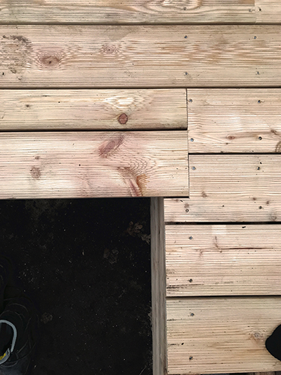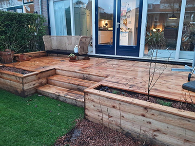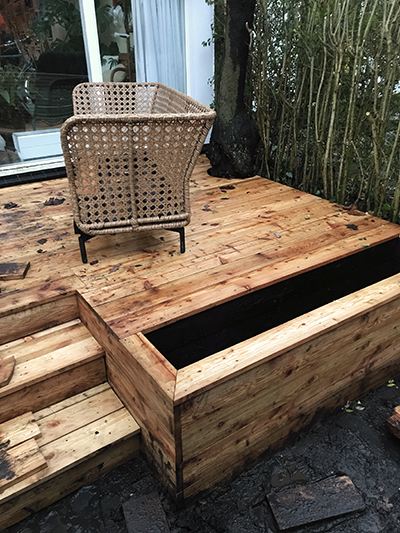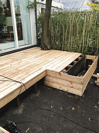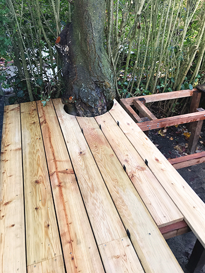 Hardwood pile construction with terrace flooring curving around the tree and extending from veranda dimensions. Hugging the stairs and the lip of the deck are natural soil garden bed boxes.