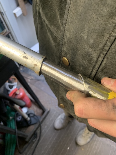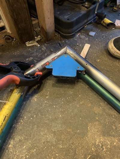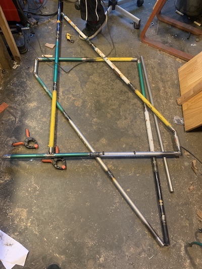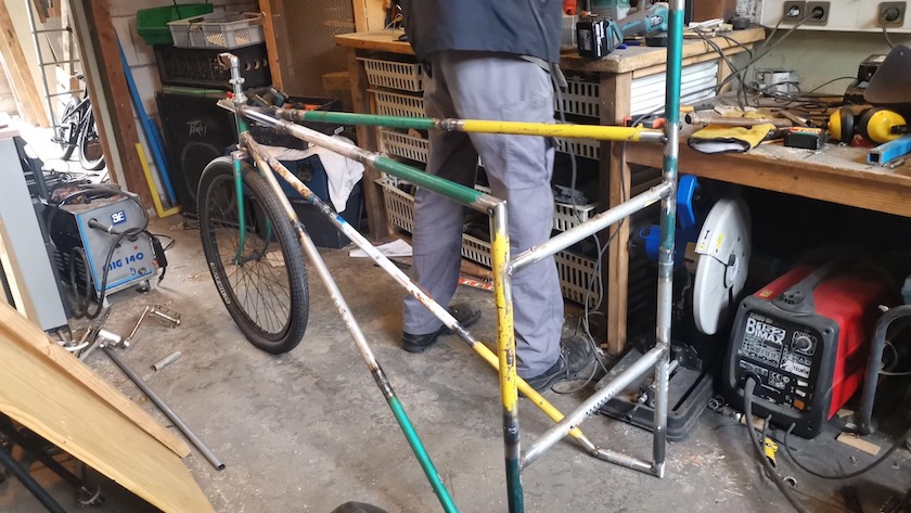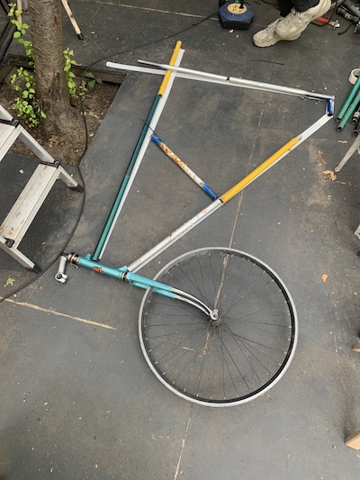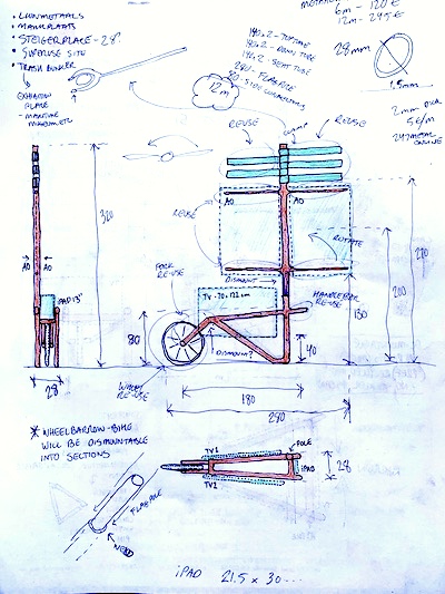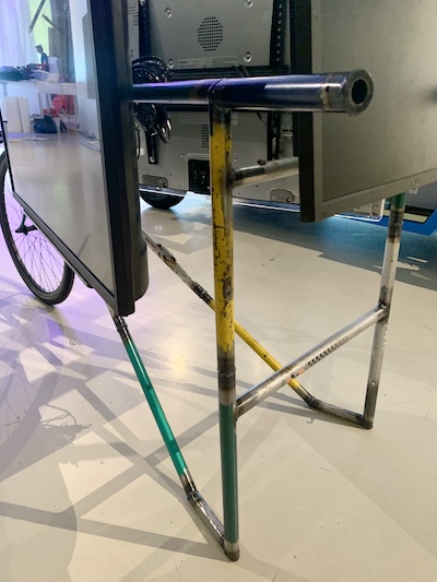 The 'wheelbarrow-bike' is made entirely from old frames. Even the seat-stays were used as part of the dis/mountable flag pole, which can be moved around and slip-fit into different configurations to fit different sized posters. The secret connection for extending the frame tubes was done via old seat posts that fit exactly inside tube frames.