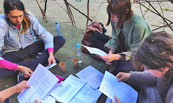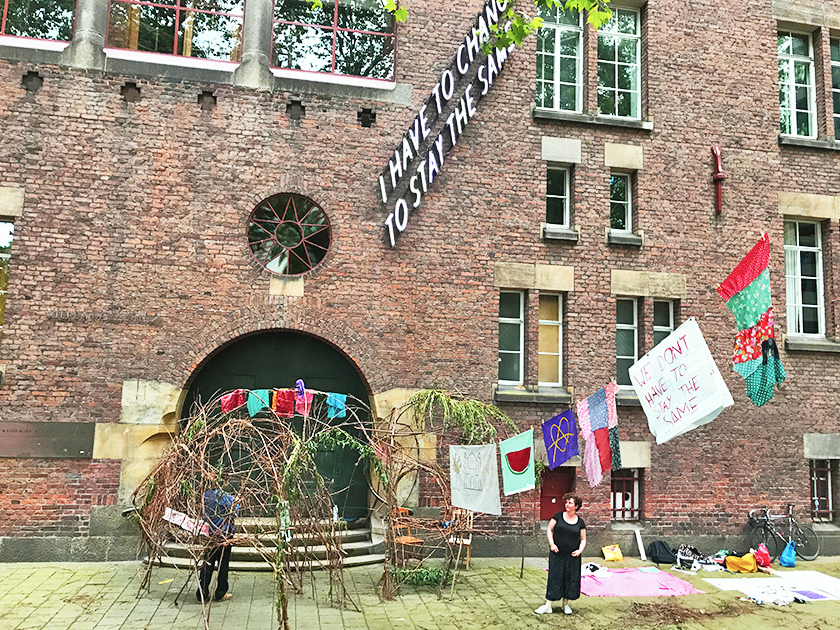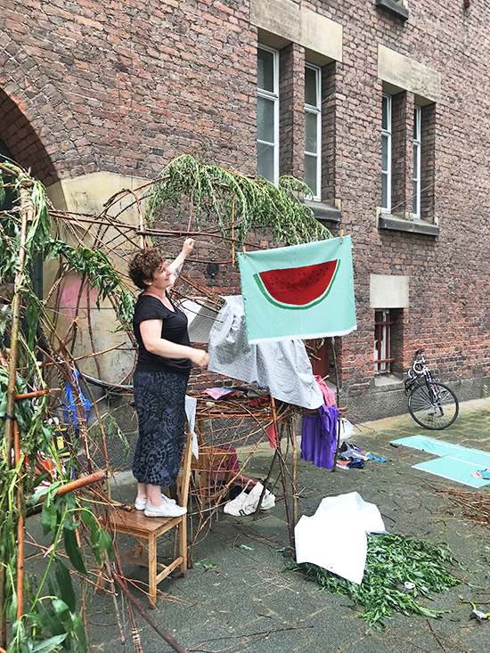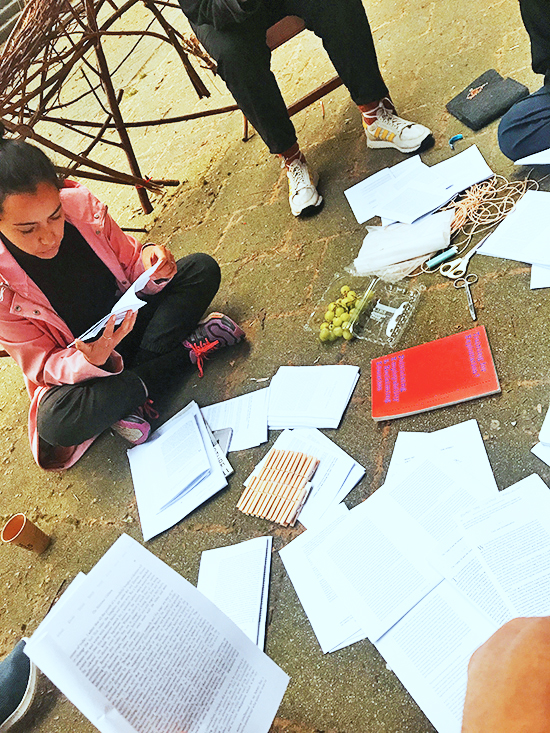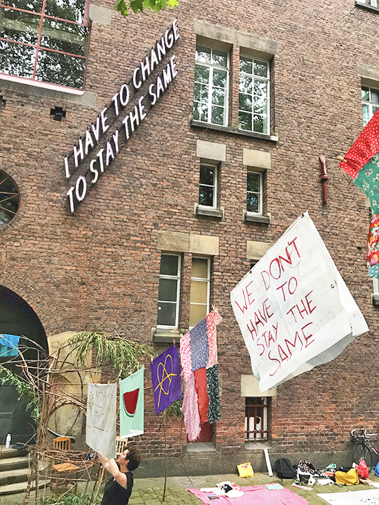 The structure is the collective result of many hands and voices, to start a conversation about how far institutional control goes. We decided together which lines to follow, negotiating the weave to make a tension capable of holding messages, banners, flags and zines— to make spaces for intimacy and rest, or for assemblies and readings.