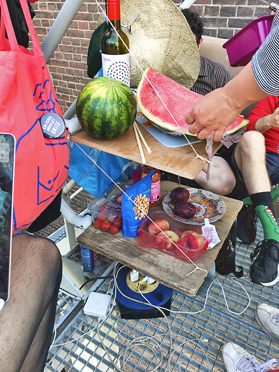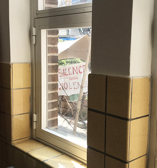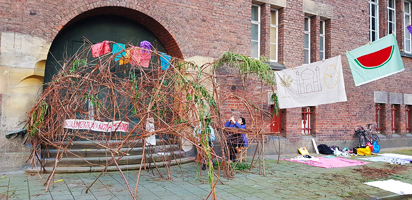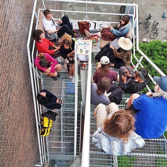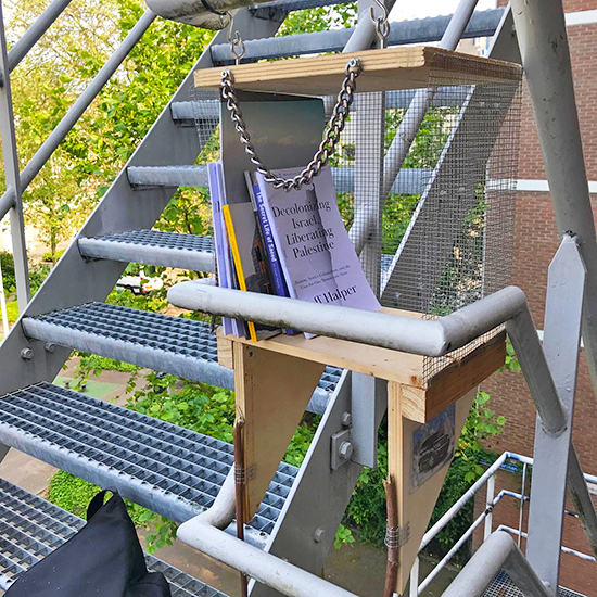 An occupation of the fire escape of the Piet Zwart Masters of Fine Art building emerged after students were forcibly denied to hang a banner in solidarity with Palestine and the Sheikh Jarrah neighborhood of Jerusalem. Seven days of protesting ensued; broadcasting readings on Palestine, sharing food and drink and loitering across concerned parties of students, alumni, teachers and coordinators. And for bodies to be able to stay an architecture of comfort and resistance is needed.