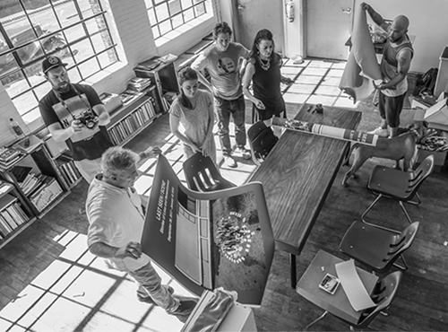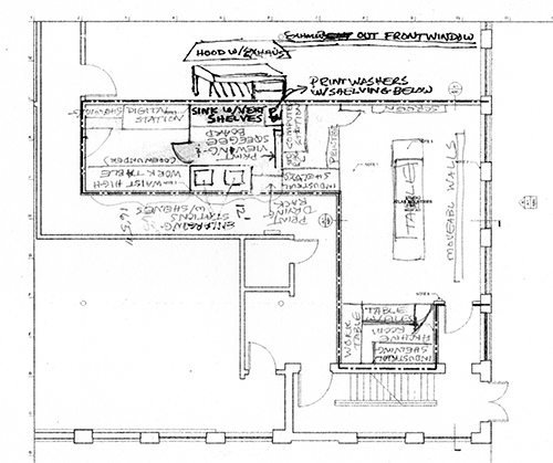 The design challenge was to create a public functioning workshop and exhibition space within a privately owned studio. The private darkroom and studio of Vince Cianni, as well as the appointment-based archive of George Platt Lynes and Anatole Pohorilenko, were wrapped around a deliberately 'un-designed' open work space that serves as the publicly visible gathering space of the photo project. By giving window and street priority to the public space and the private spaces left un-intruding yet accessiblle, the users of the open space can effectively be ‘given the keys’ to a flexible area so that each iteration of workshop and exhibition can take ownership, yet retain dialogue and support from the private resources.