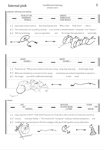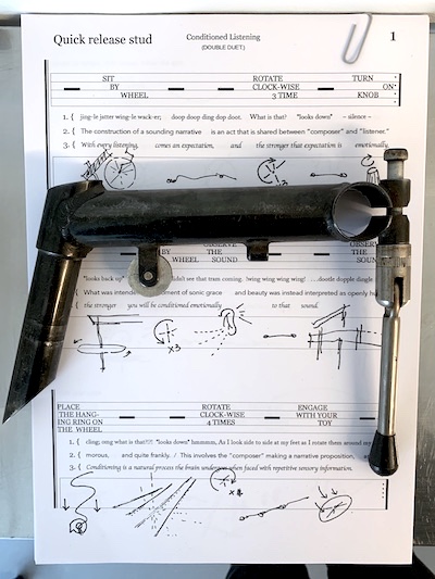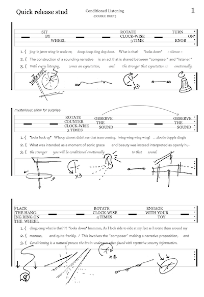 Conditioned Listeing is a constructed acoustic space, conceived not in relation to the visitor as a spectator but as a playful participant in an active testing site on the shared creation and responsibility of composer and listener. A score sheet, layered with relational sounding diaries and multi-verging paths, joins visitors, and us, into the process of researching, proposing and composing a narrative; constructing the exhibition through how an object and sound feels. The dual acts of composition and listening, opens up the question of what agent, object, or action we are conditioned to or what the sound signifies.