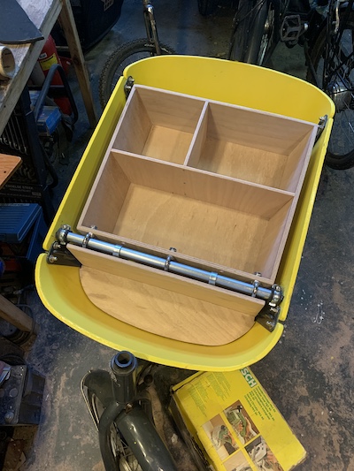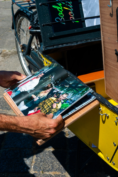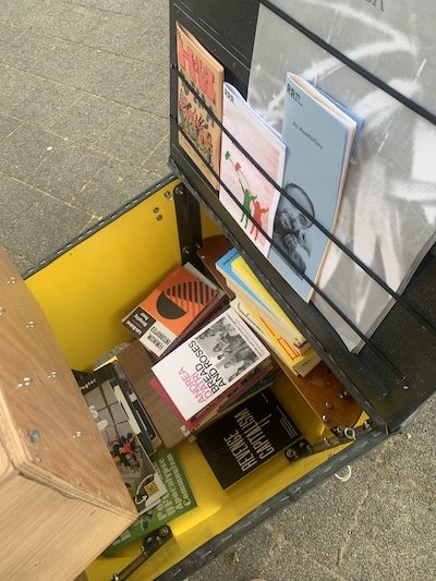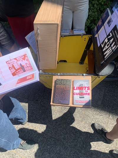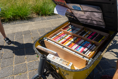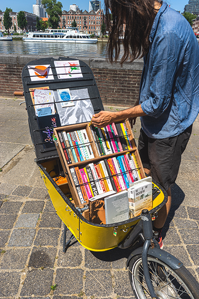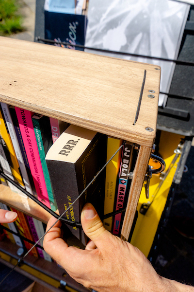 Short on studio space, and following the interests of what happens when things stay in motion, RRR needed a swiss army knife of a library that can unfold a plethora of possibilities out of a tighly packed cargo bike. It folds, it moves, it swings, opens, closes, holds, hangs, swivels, keeps out the rain, lets you browse, display and very critically disassembles all back to an open bak for carrying bulk. And it has wings to fly around!!
