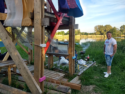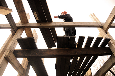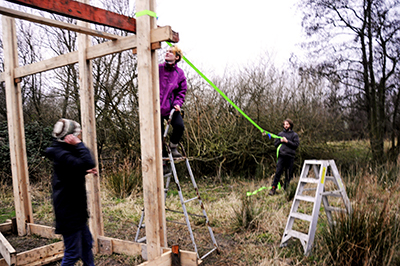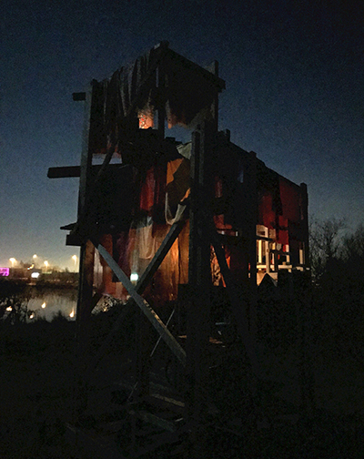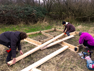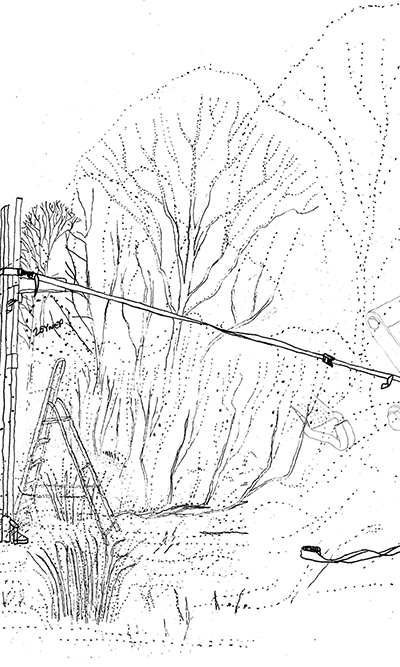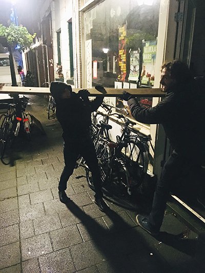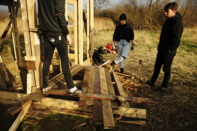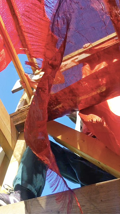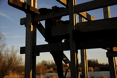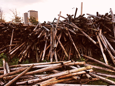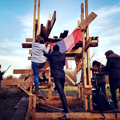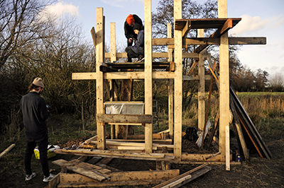 Instead, this collective process aggregated a series of close and loose friendships enduring together in the muddy peat fields beneath the runway of the Rotterdam airport, with wood scavenged through self disciplined durations across abandoned industrial terrains, building without application for permission an assemblage of beams and platforms.